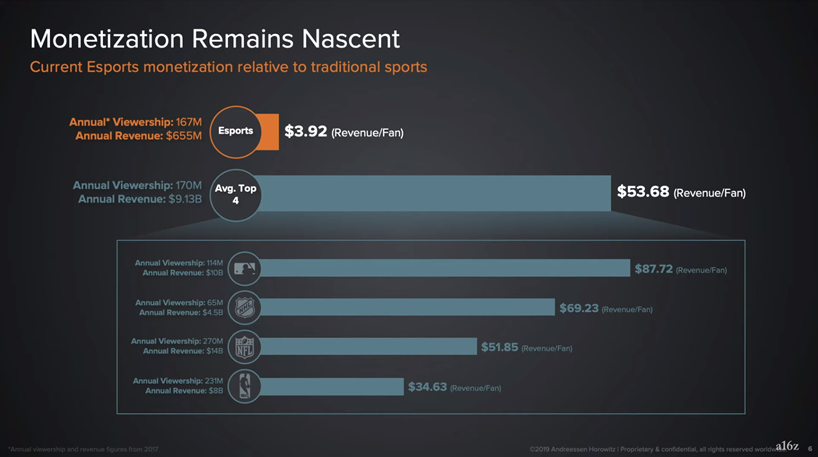위의 자료는 북미의 전통 스포츠와 E스포츠의 시청자 수를 비교하고 있습니다. 이 자료를 기반해서 판단해 보면 북미에서 E스포츠의 시청자 수는 <NBA> 정도 됩니다. 그런데 우리는 아직 북미의 어느 정도 인원이 스포츠 팬이면서 동시에 E스포츠 팬인지를 보여주는 자료는 없습니다. 그러나 없다고 해도 북미의 살고 있는 사람 모수 자체가 달라지는 것은 아니기 때문에 논리 자체는 계속 진행할 수 있습니다. 이를 테면 우리의 논리는 '사는 사람 자체가 달라지는 것은 아니기에 북미의 특정 소비자가 전통 스포츠의 팬이면서 동시에 E스포츠의 팬일 수 있다'라고 가정합니다. 이 팬은 당연히 전통 스포츠에 지출을 할 수도 있고 E스포츠에 지출을 할 수도 있습니다. 즉, 소비력의 잠재적인 환경이 같다는 뜻입니다. 다시 한번 정리해서 말씀드리면 '만약 북미의 전통 스포츠의 시청자가 연간 한 스포츠에 평균 약 50달러를 지출한다면, E스포츠에 그렇게 지출하지 않을 특별한 이유가 없다'라고 설명할 수 있습니다. 이는 결론적으로 E스포츠 시장이, 소비자를 지금과 같이 지속적으로 모을 시, 전통 스포츠만큼 커지지 않을 이유가 없다는 것과 같은 사고를 이끌어냅니다.