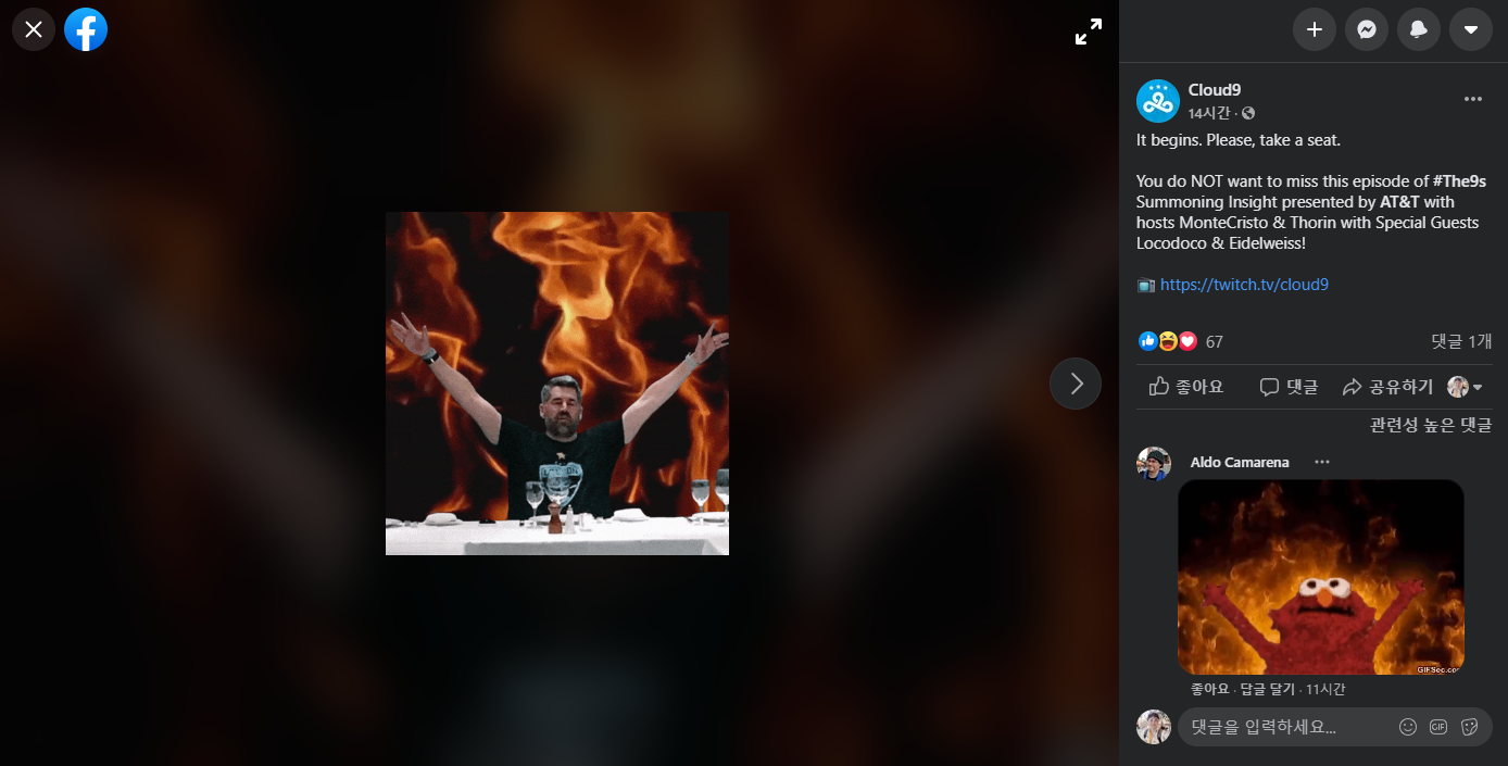 위 이미지는 C9의 그 프로그램에서 방영한 영상 중 캡처 화면입니다. 그 더 위의 CLG의 그것과 풍경이 거의 비슷합니다. 다만 차이점이 있다면 이 프로그램은 (*단순히 팀을 소개하는 수준이 아닌) C9의 브랜드를 활용해서 만든 범용적 프로그램이라는 점입니다. 여기서 다루는 주제는 E스포츠 그 자체입니다. 위에 보이는 사람들은 어제(*5월 12일) 발생한 TSM의 '이익충돌' 사건에 대해서 이야기를 하고 있습니다. 논란의 여지가 높고 팬들의 관심이 많은 주제였기 때문에 (*C9의 팬덤의 수준을 넘은) 시청자의 반응이 매우 좋았습니다.