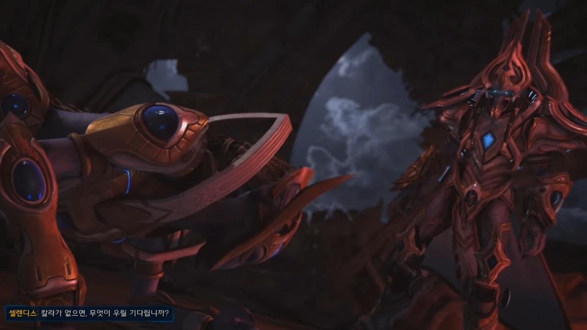 우리가 아는 바와 같이 프로토스에게는 말도 글도 필요 없습니다. 그들은 (진화된 종족이기 때문에 목덜미에 있는) 칼라(신경삭)로 모든 감정과 의사를 소통합니다. 공허의 유산은 아몬의 지배로 부터 벗어나게 하기 위해 제라툴은 자신의 목숨을 버려 아르타니스의 칼라를 잘라내지요. 이때 하는 대사가 "My life for Aiur" 입니다. 이후 아르타니스는 중추석을 충전한 후 잠시 아몬의 지배로부터 해방된 아이어의 프로토스들을 그들의 모든 것인 칼라를 잘라내도록 설득해야 했습니다. "칼라가 없으면 무엇이 우리를 기다립니까?" 그 질문에 아르타니스는 제라툴이 목숨을 바쳐 그에게 준 그 가치를 말합니다. "자유" 과연 누가 이 장면을 보면서 눈물을 흘리지 않을 수 있겠습니까?
